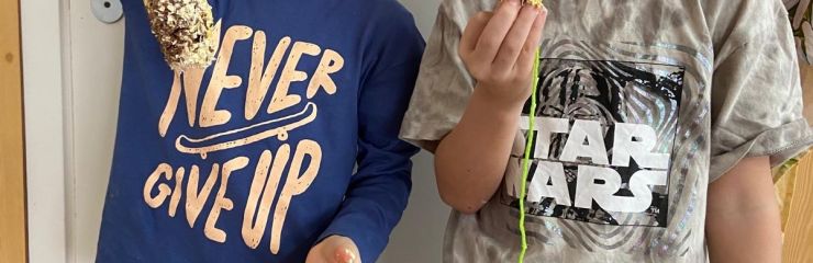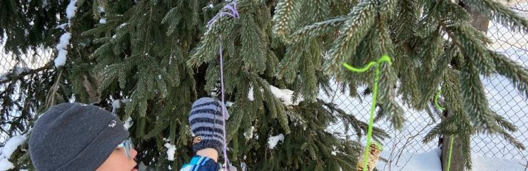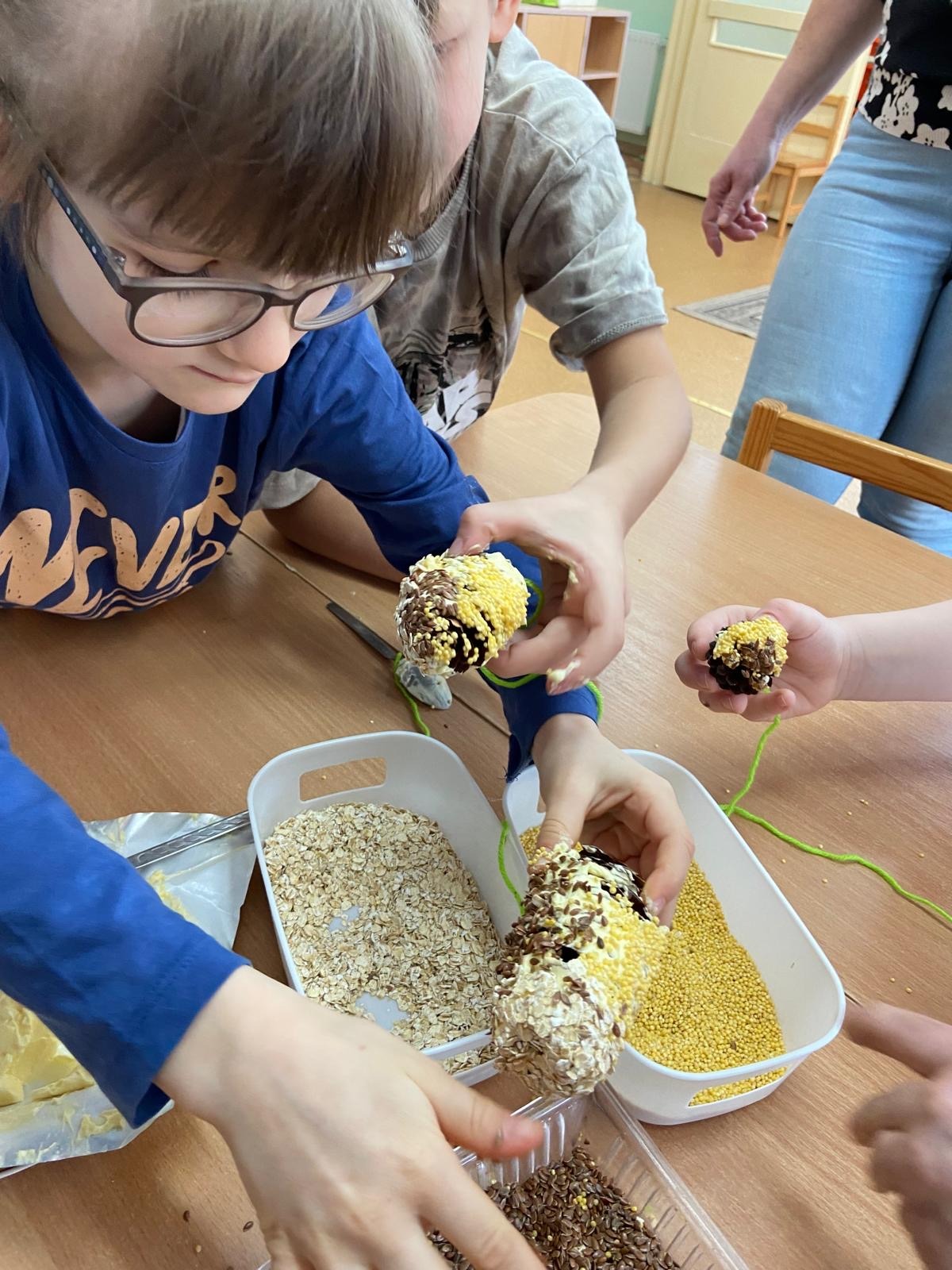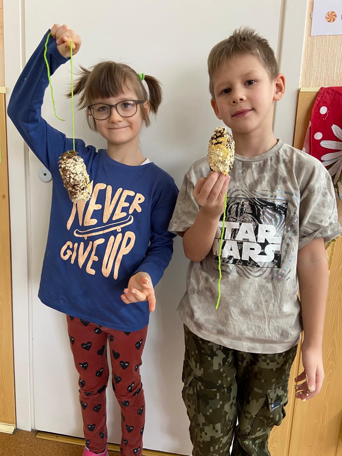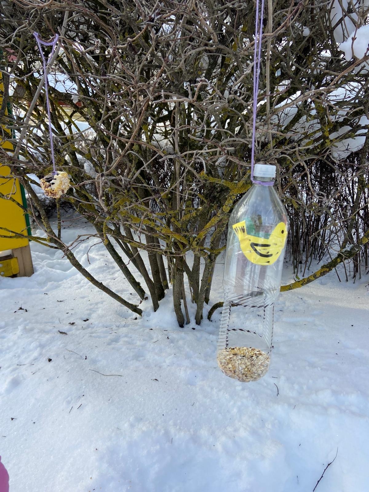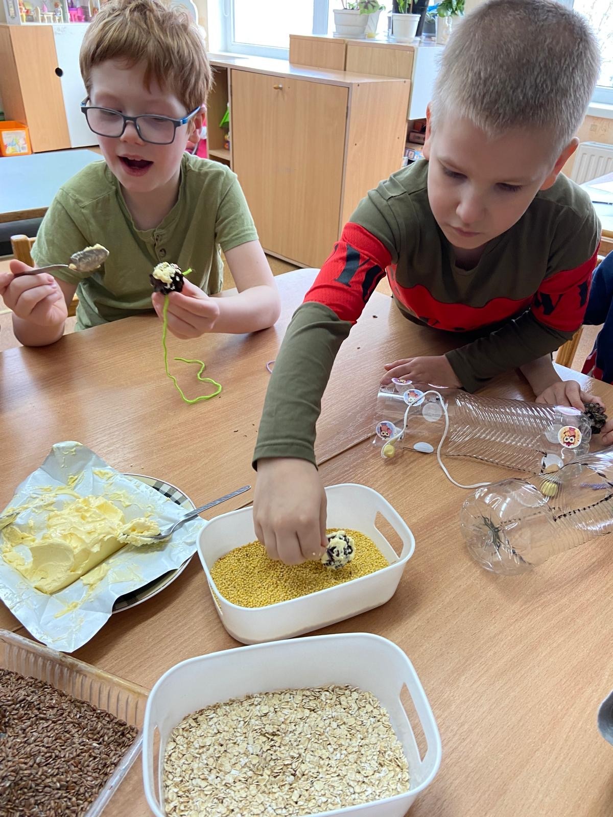 Kad barotavas un čiekuri bija gatavi, mēs tos aiznesām uz mūsu laukumiņu un pakārām egles zaros. Tagad mēs varam pa logu vērot, kā putni atlido un ēd mūsu sagatavoto barību.