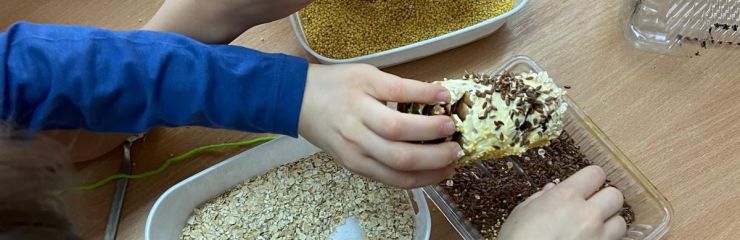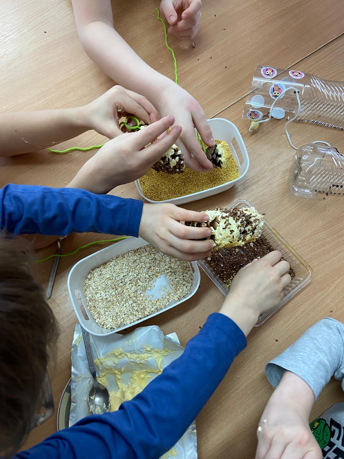 Pēc sarunas mēs ķērāmies pie praktiskā darba un gatavojām putnu barotavas. Uz čiekuriem mēs smērējām sviestu un pēc tam tos apbērām ar sēklām. Darbojāmies rūpīgi un ar lielu interesi, lai sagatavotā barība putniem būtu piemērota.