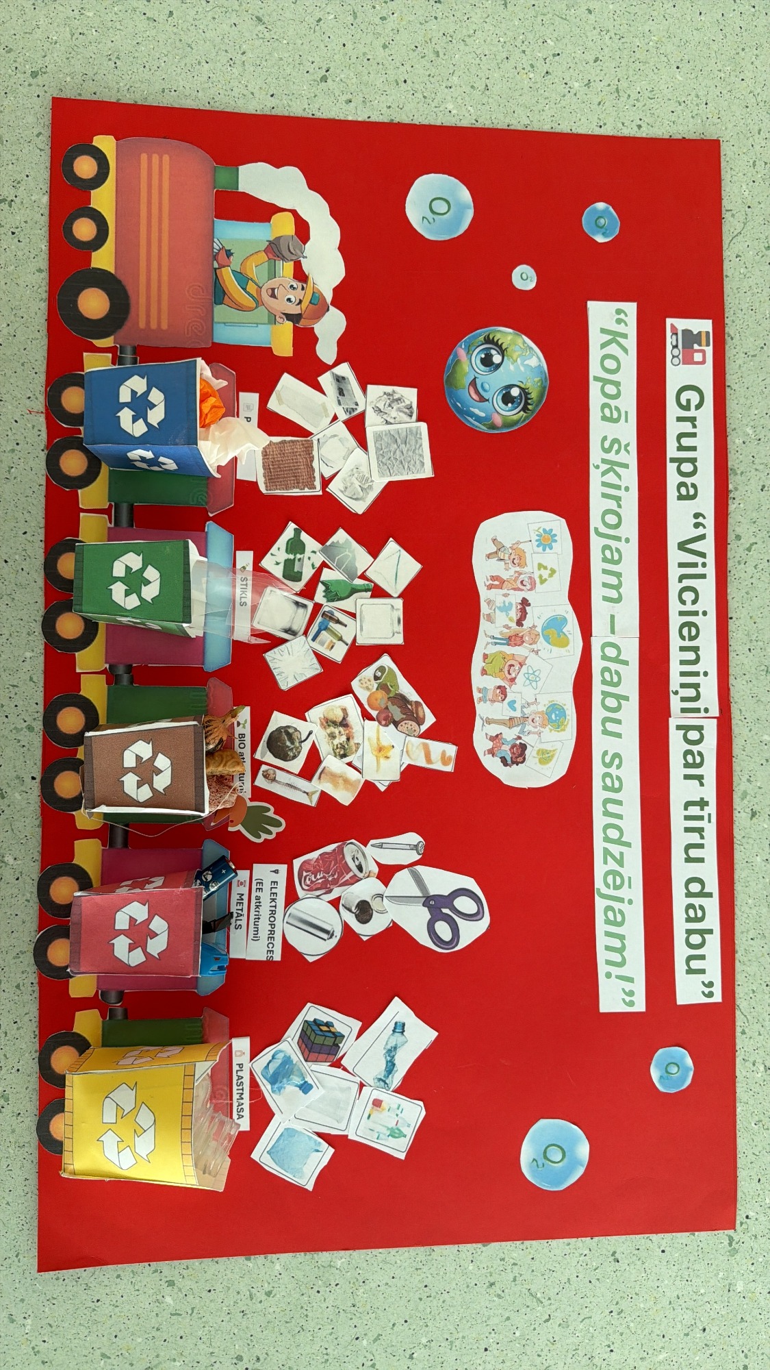 Mūsu mērķis ir radīt apstākļus bērniem izziņas aktivitātes attīstībai, veicināt cieņu pret apkārtējo vidi, jūtu audzināšana. Atbildība par tās saglabāšanu un attīstību. Radošās domāšanas veicināšana. Komandas darba prasmju rosināšana. Koncepcijas formulēšana par to, kā bērni var palīdzēt pasargāt un saglabāt dabu.Mēs ar bērniem dodamies atkritumu šķirošanas tūrē, lai izpētīt un izzinātu. Noskatāmies multfilmu, kur šķiro atkritumus un kas pēc tam ar tiem notiek.
