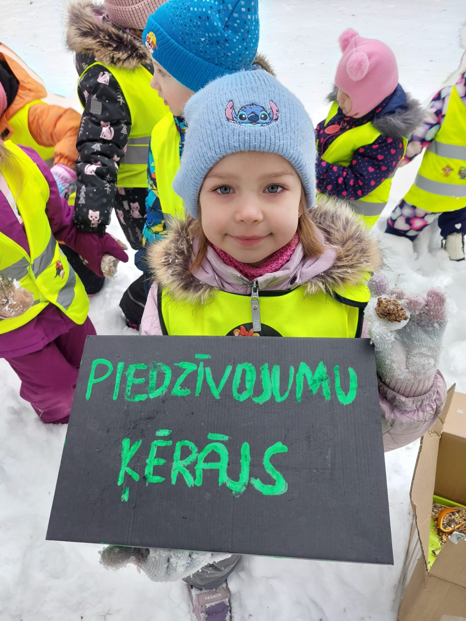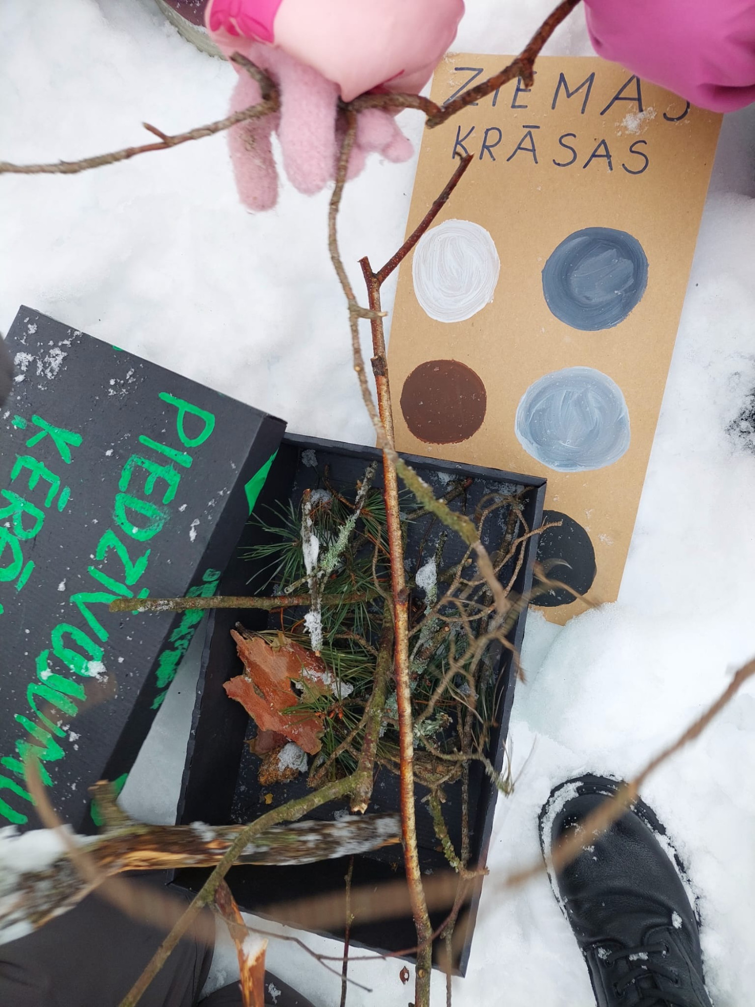 Mums patika itin visi uzdevumi: meklēt pēdas sniegā, meklēt un atrast mūsu iemīļotās skudriņas Kāpēcītes aizsnigušo skudru pūzni, naski izvietot mežā sarūpētos našķus meža iemītniekiem, meklēt šajā sniega baltumā vēl citas ziemas krāsas, salasīt jaunas dabas lietas mūsu “Piedzīvojuma ķērājā”, klausīties pārsteidzošo klusumu mežā, un, protams, pēc labi padarīta darbiņa, sarīkot pikniku ar siltu tēju un sviestmaizēm, un neaizmirst ievērot likumu, ka “Dabā ejot, ko atnesi, to aiznes!”