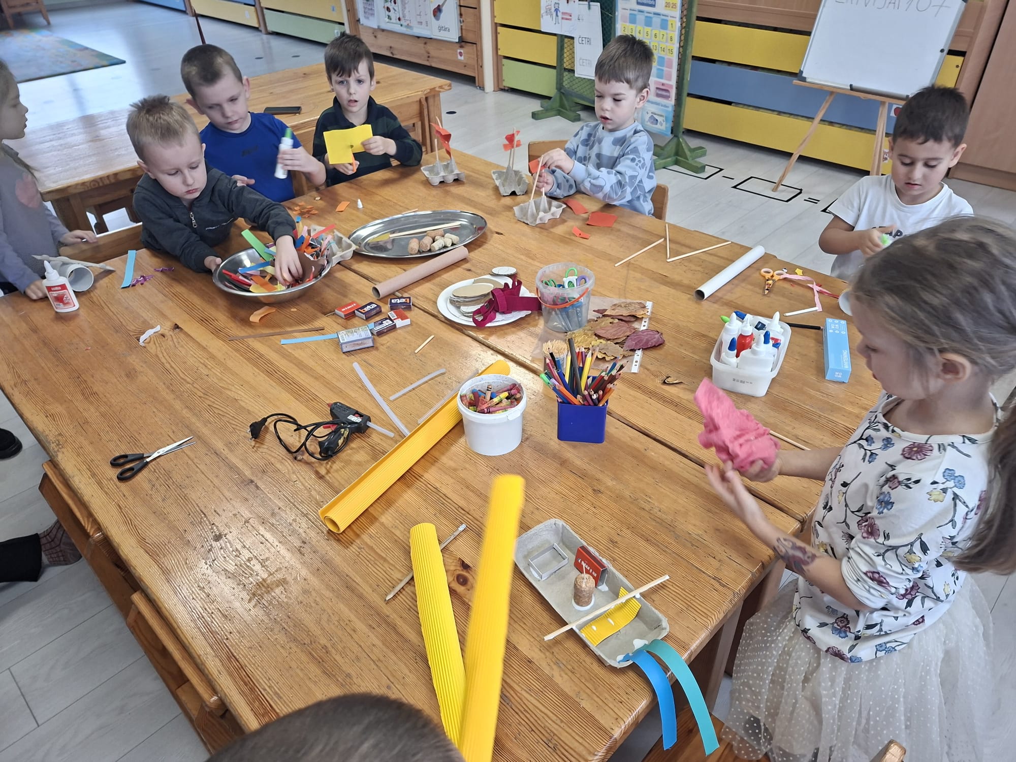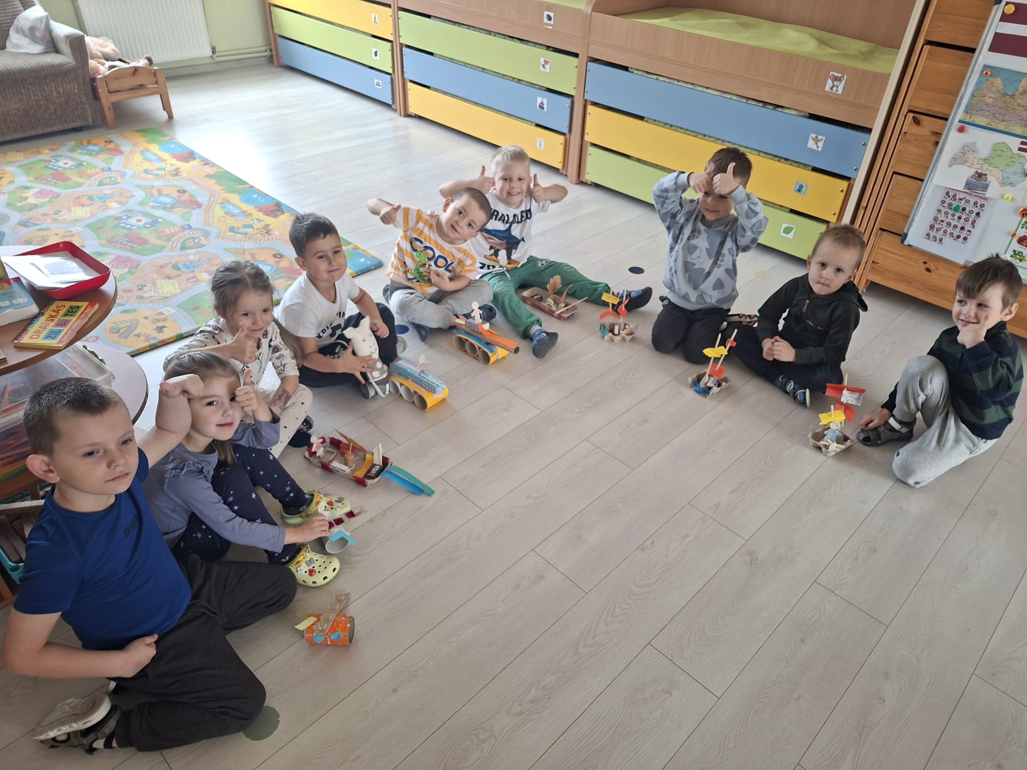 Bērni kopā ar skolotājiem pārvērta parastu kartonu par kaut ko īpašu – pašu veidotiem transportlīdzekļiem, ar kuriem tagad var brīvi spēlēties un attīstīt iztēli. Tapa gan mašīnas, gan lidmašīnas, gan laivas un pat bērnu izdomāti “superbraucamie”.