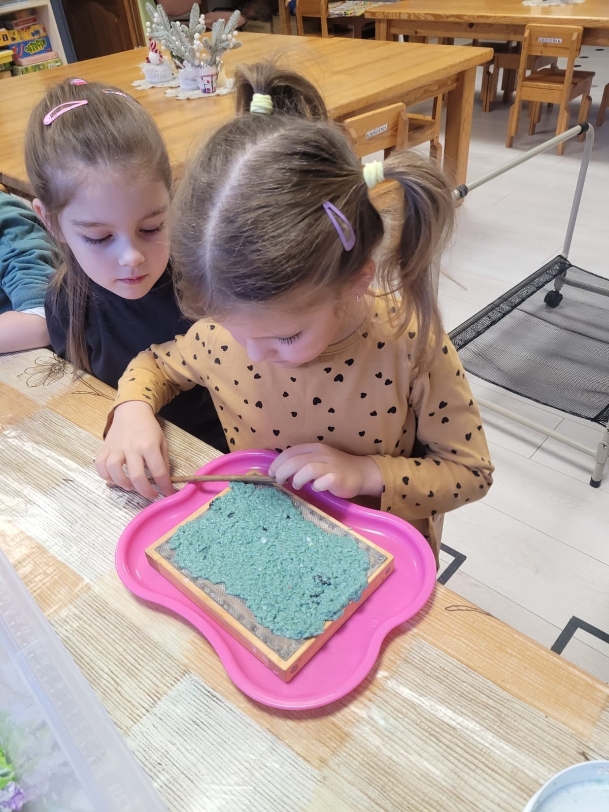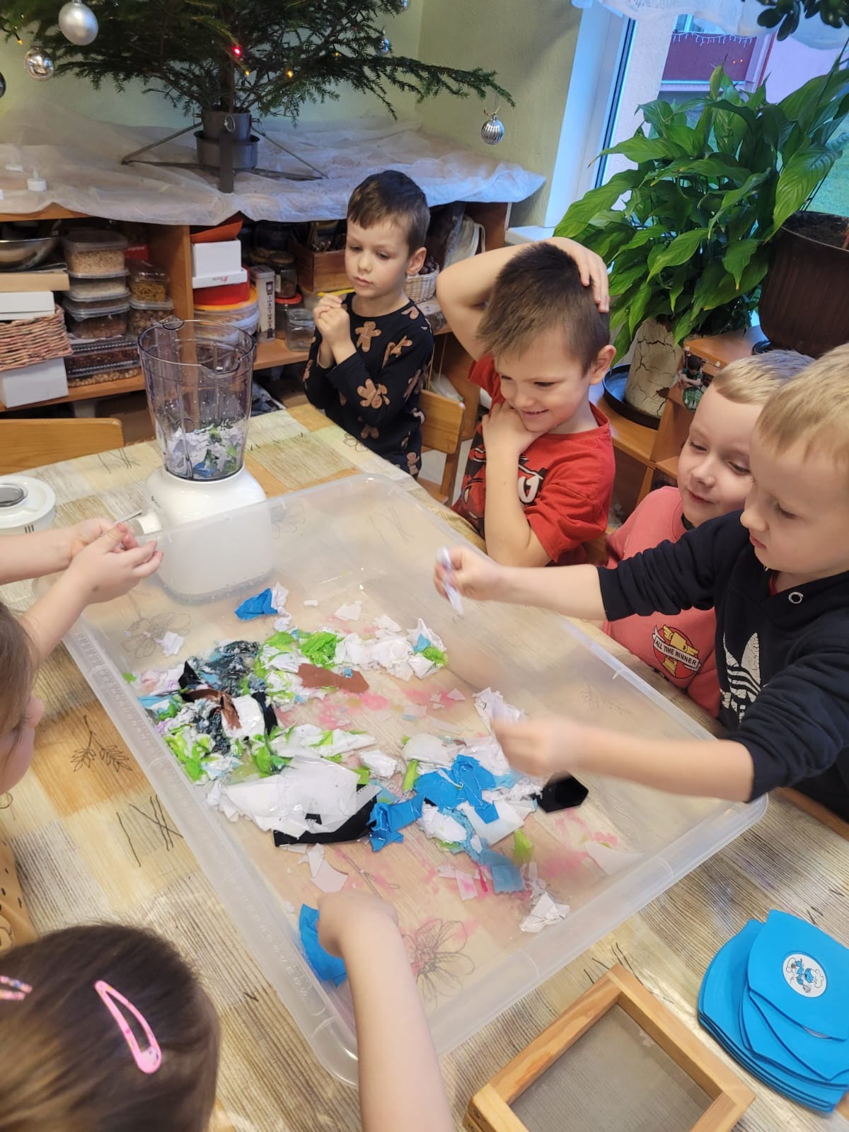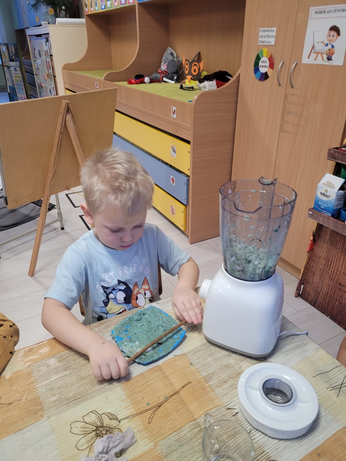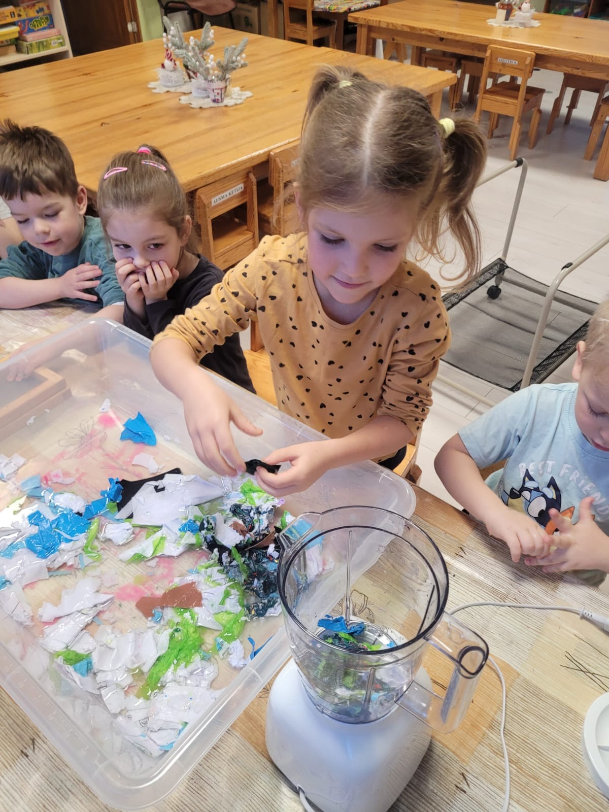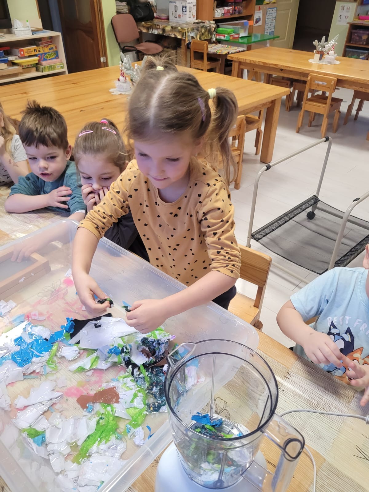 “Bitīšu” grupas bērni piedalījās aizraujošā un izglītojošā nodarbībā – papīra izgatavošanā no otrreizējās izejvielas – kartona papīra. Praktiskā darbošanās palīdzēja bērniem izprast, kā ikdienā izmestie materiāli var iegūt jaunu dzīvi, vienlaikus veicinot videi draudzīgu domāšanu.