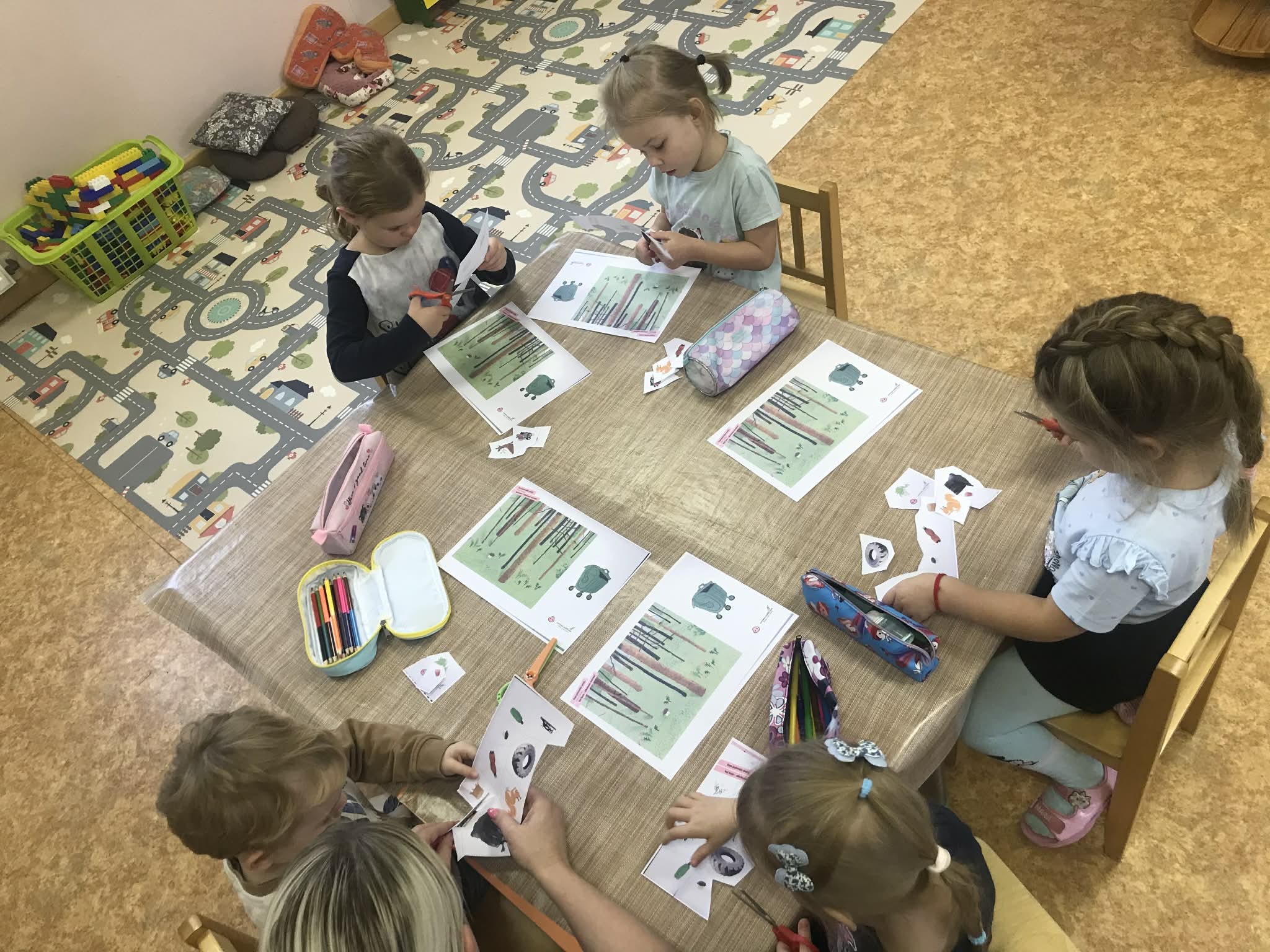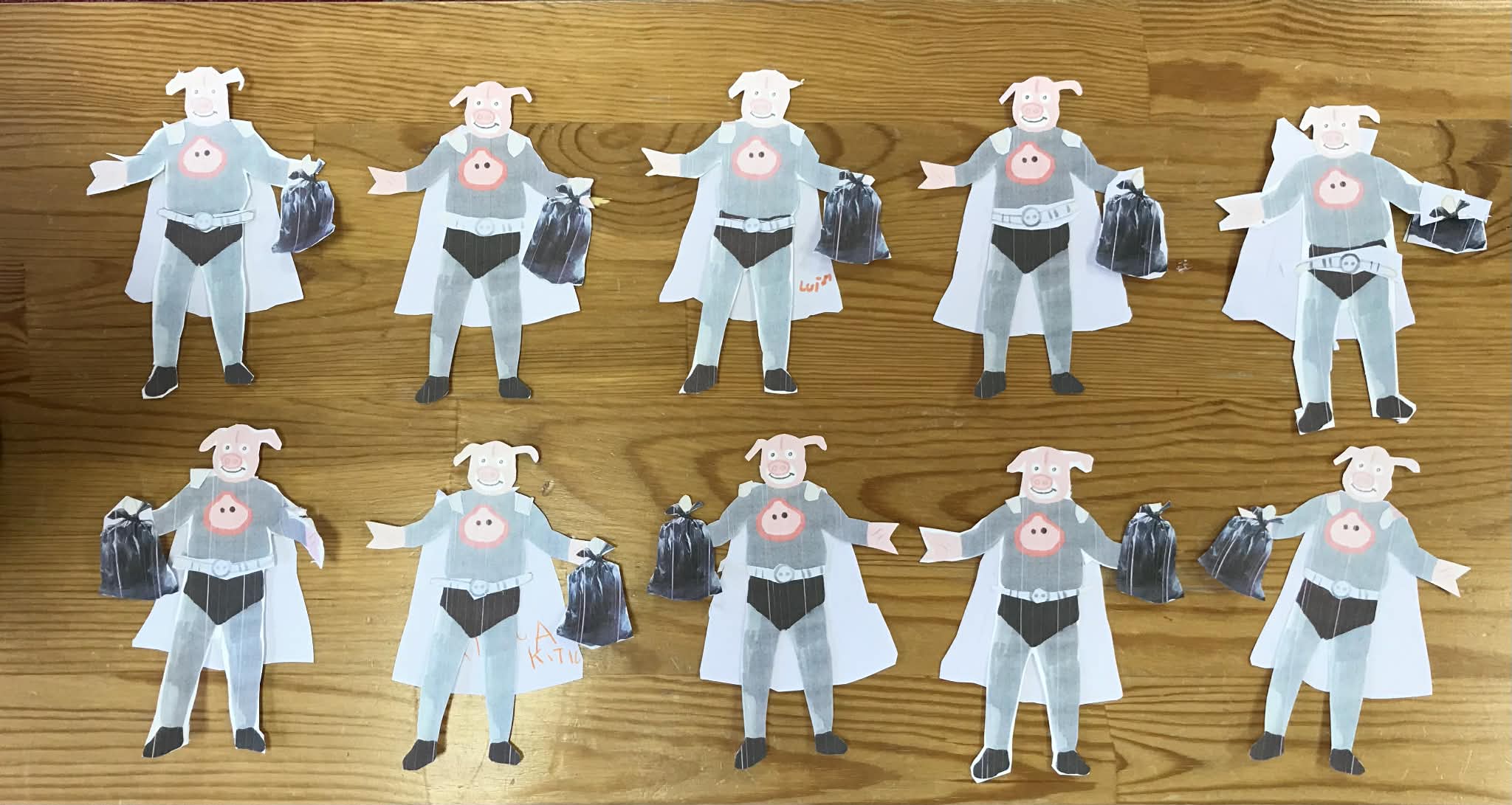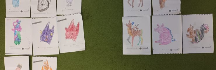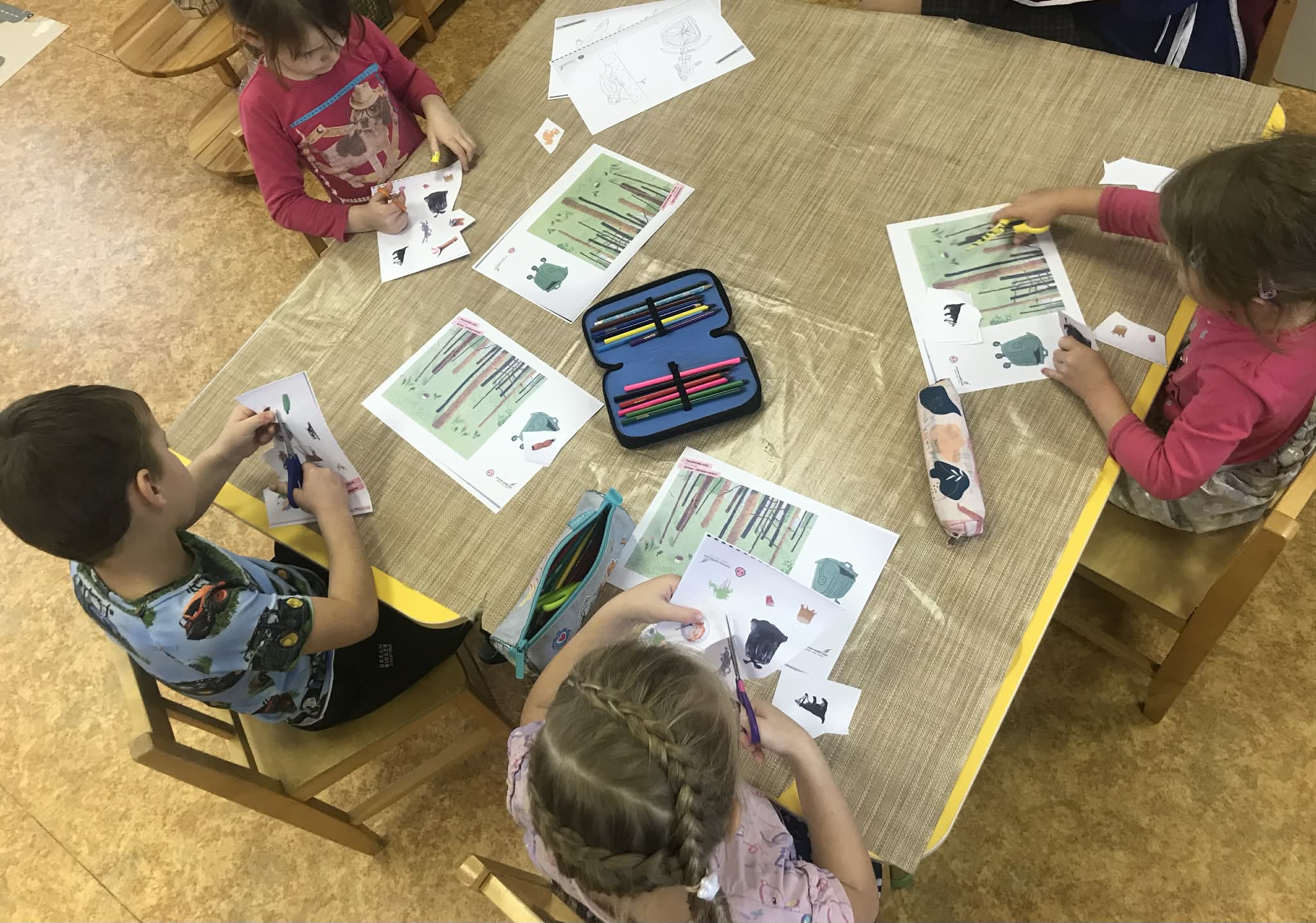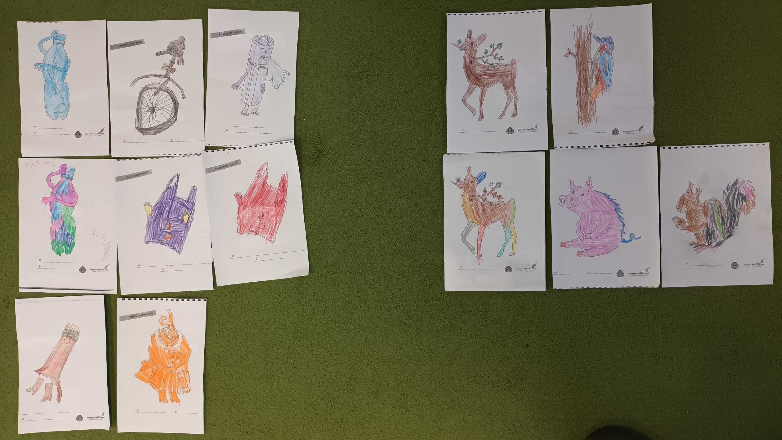 Ziņojam, ka esam noslēguši pirmo tēmu un iepazinušies ar visiem "Meža netīrajiem noslēpumiem". Noklausījāmies atlikušos stāstus par atkritumiem, un krāsojām gan atkritumus, gan meža zvērus. Pēc tam bērni ar priecīgu un bēdīgu smaidiņu atzīmēja un stāstīja pārējiem, kam ir vieta mežā un, kam - nē. Visvairāk bērniem patika veidot Cūkmena lellītes, kuras viņi gatavoja ar lielu atbildību un rūpību. Bērni bija sajūsmā, kad teicām, ka lellītes jānes mājās un par Cūkmenu jāpastāsta arī ģimenei. Viņi šo uzdevumu uztvēra ļoti nopietni un savā starpā jau sāka pārrunāt, ko stāstīt ģimenei vakarā, kad dosies mājās.