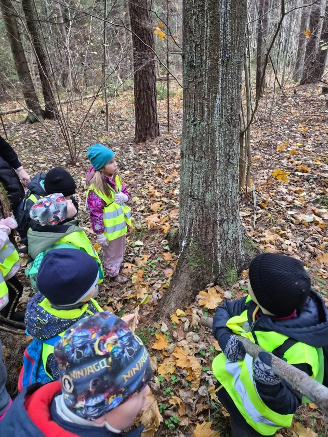 Spēlējām jautro spēli “Laižam mežā”, vērojām apkārtni un meklējām krāsas, kas redzamas katra bērna zeķē, salīdzinot tās ar dabā atrodamajām. Tas rosināja bērnus pamanīt nianses, pētīt lapas, zarus, koka mizas un meža zemsedzi.