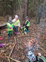 Nonākuši mežā, iekārtojāmies mūsu mazajā piedzīvojumu vietā, klājām galdu ar līdzi paņemtajiem našķiem, kurinājām ugunskuru un cepām desiņas, baudot siltumu un kopības sajūtu.