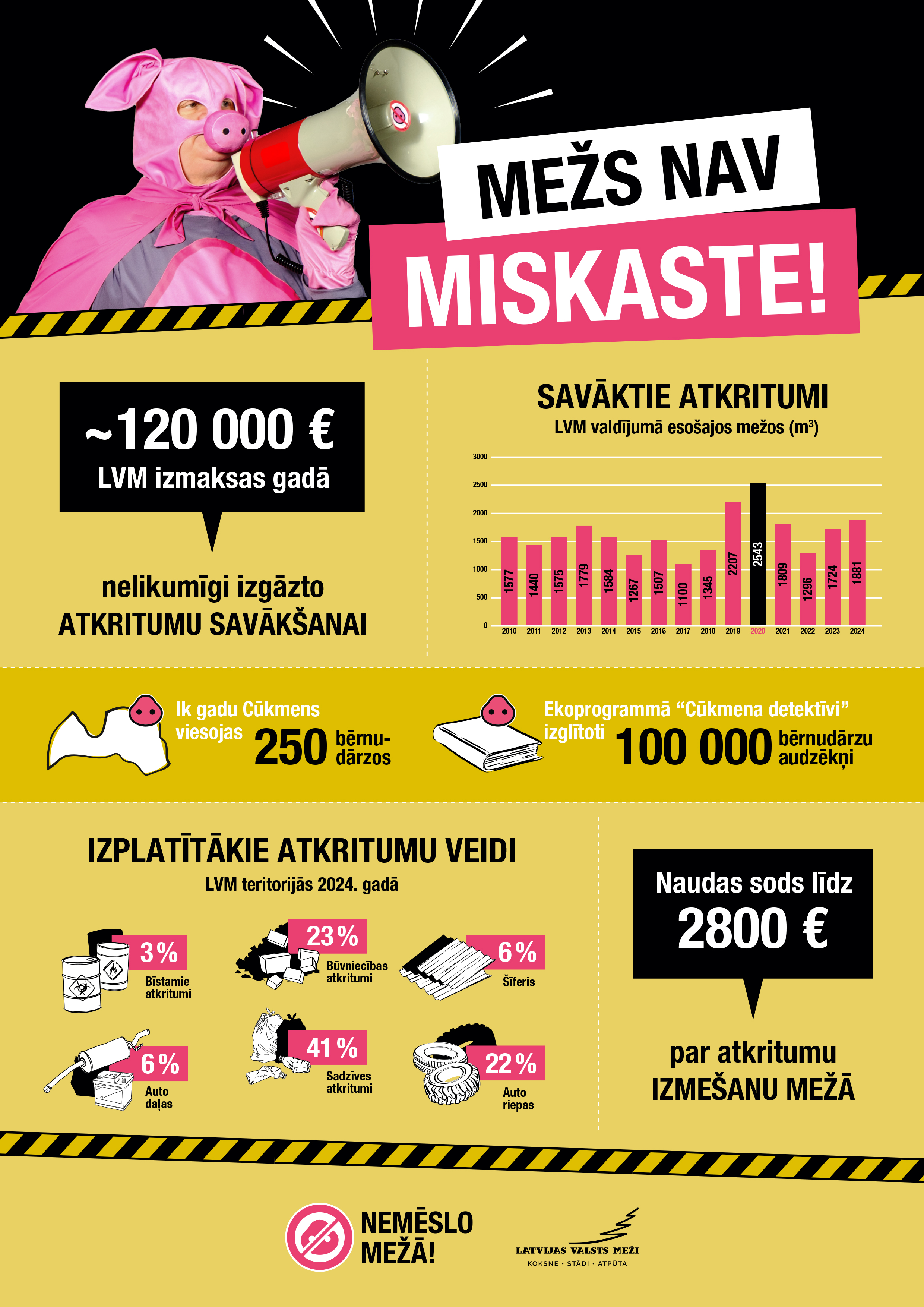 Es esmu Cūkmens – tīru mežu aizstāvis. Ik dienu cīnos, lai Latvija kļūtu par tīrāko zemi pasaulē. Taču man ir sliktas ziņas: atkritumu apjoms mežos jau atkal pieaug!