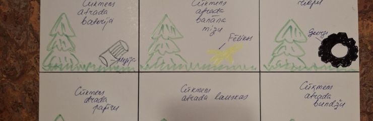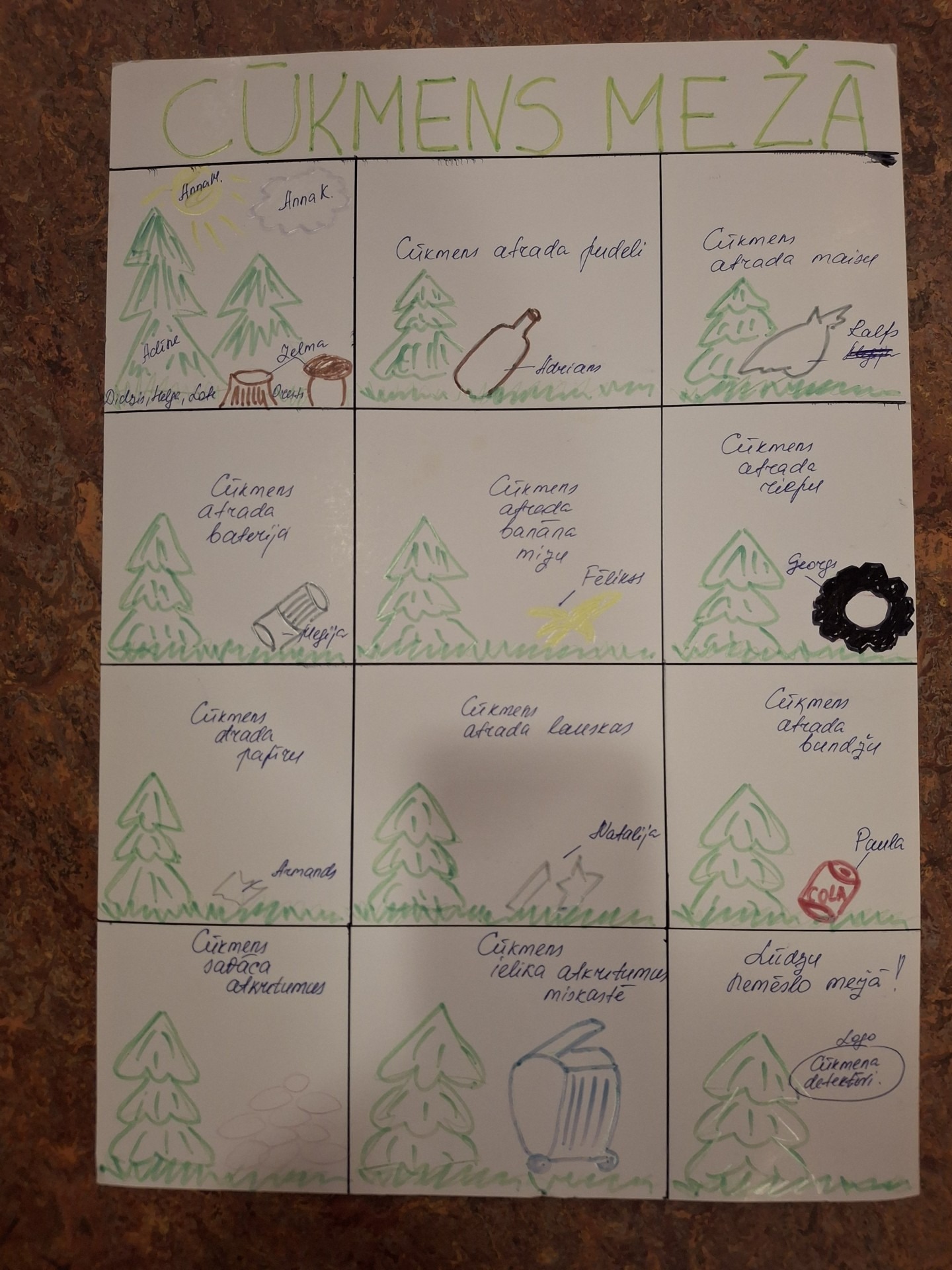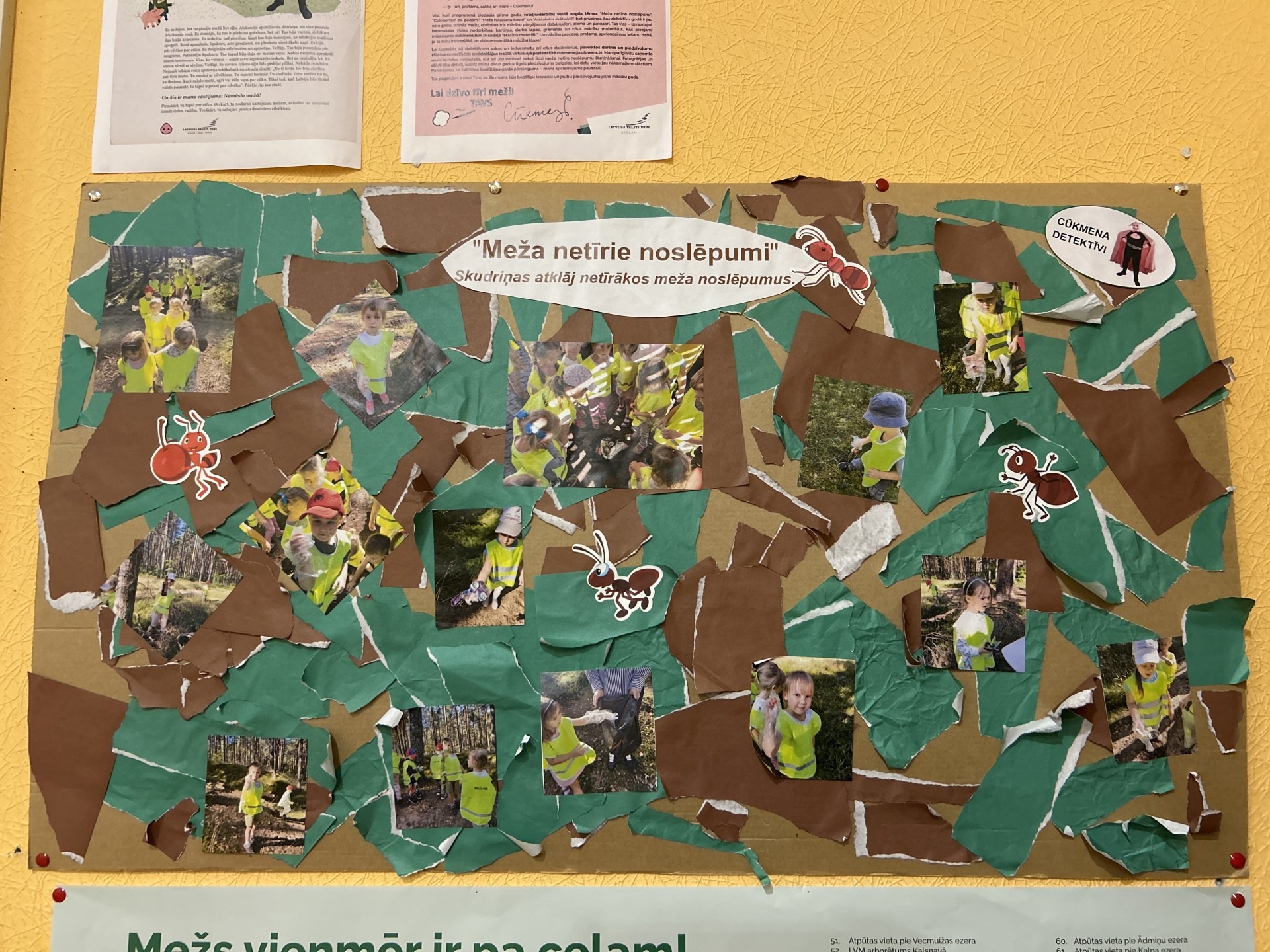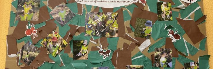 Vienā no tām nodarbībām bērni iepazinās ar Cūkmenu, iepazina atkritumu veidus, izveidoja uz papīra savu mežu un lai nostiprinātu apgūtās zināšanas, devās uz mežu meklēt meža netīros noslēpumus. Mežā bērni atrada un patstāvīgi nofotografēja daudz atkritumus, kā arī savāca tos maisiņos. Atgriežoties dārziņā, mēs izprintējām visu atrasto atkritumu attēlus un izveidojām no tiem kolāžu.