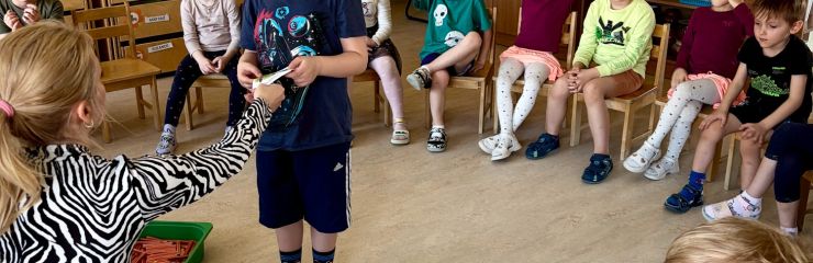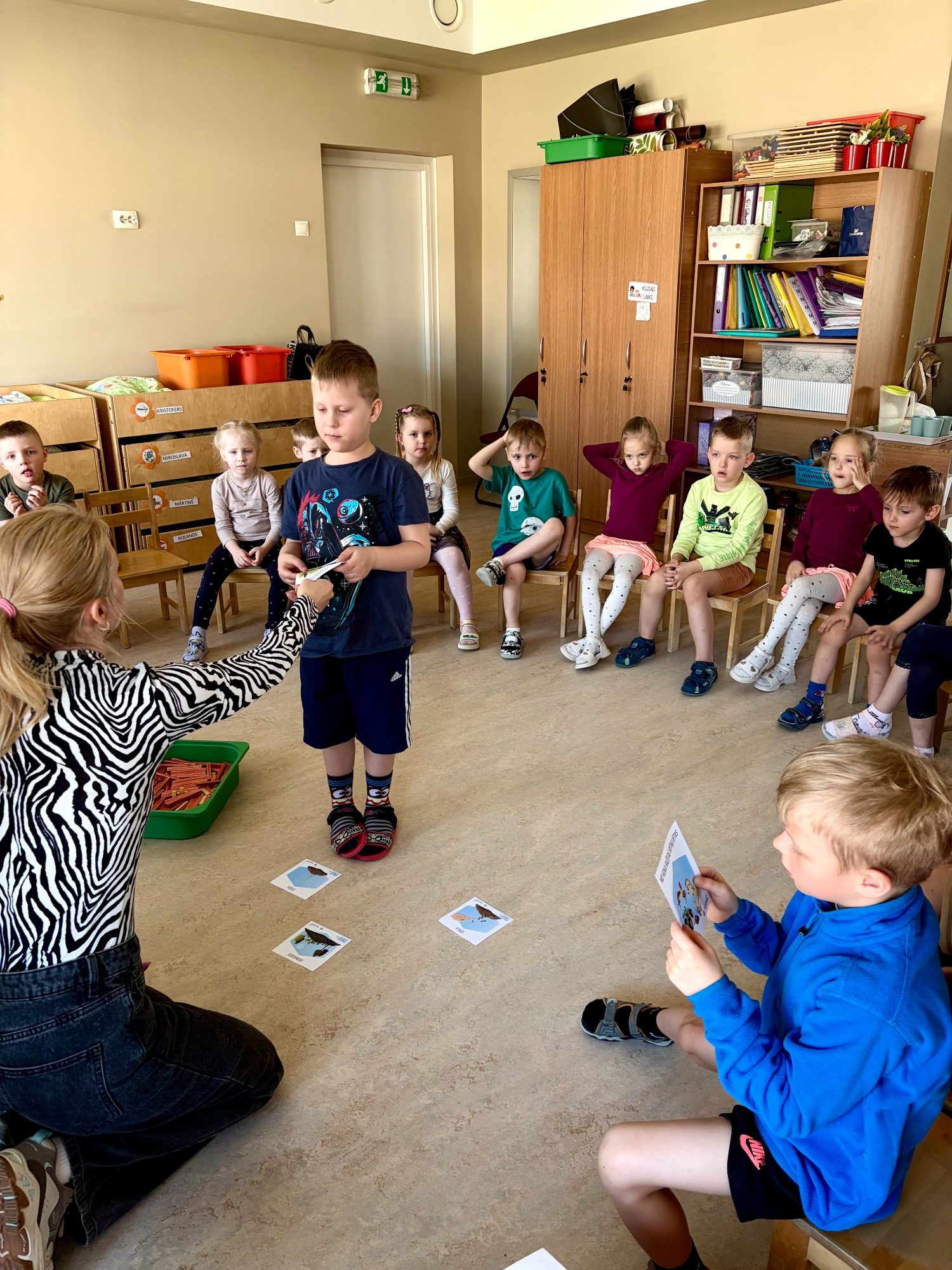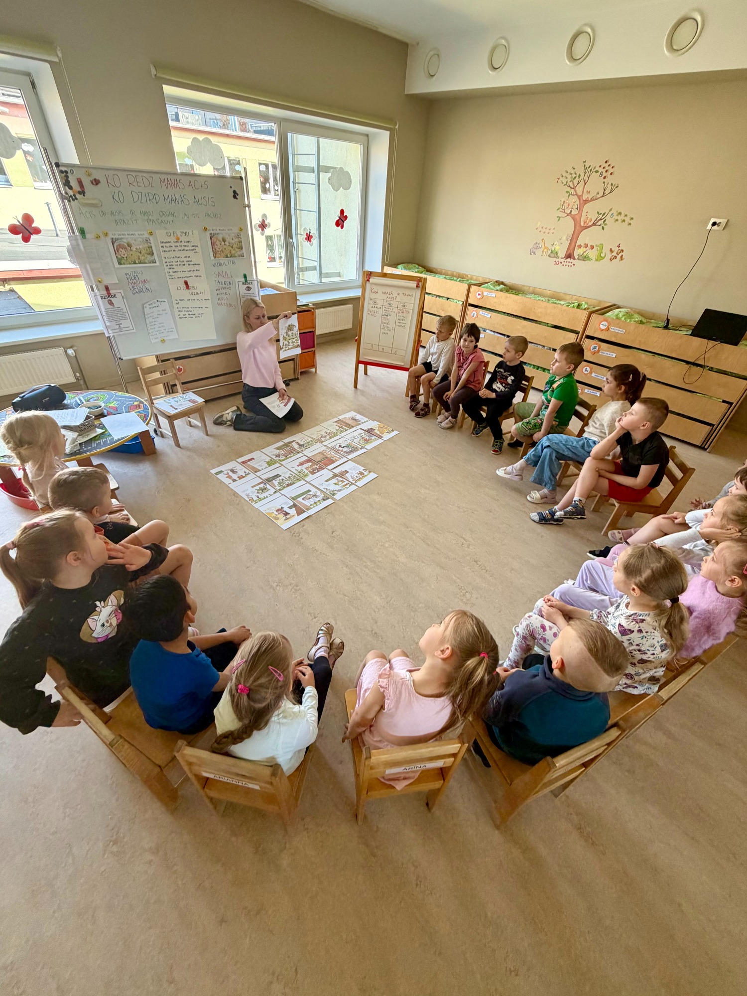 Dienas noslēgumā mēs devāmies ceļojumā apkārt bērnu dārzam, kurā tēlojām dažādus meža zvērus un putnus - lecām kā zaķi, dipinājām kā lāči un soļojām kā dzērves augstu kājas cilājot. Un, protams, spēlējām spēli ar dzijas kamolu. Tā bija īpaši interesanta un priecīgām emocijām pilna. Katrs bērns vēlējās būt daļa no skaista un tīra meža. Mūsu mežā satikās gan vairāki lāči, zaķi, lūši, kaķi un pat dinozaurs.